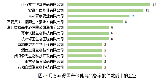 按备案人来看,9月共有37家企业获得国产保健食品备案凭证。其中,江苏艾兰得营养品有限公司拿到12个批件,获批数量最多。