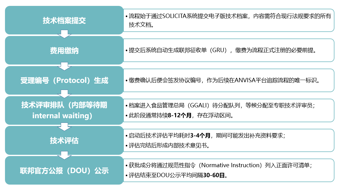 根据经验,ANVISA新型食品审批流程周期从材料提交到联邦官方公报(DOU)公示通常需要12到18个月的时间。但审批前等待时间及前述预审阶段的持续时间存在显著波动,主要取决于ANVISA内部工作负荷的变化。
