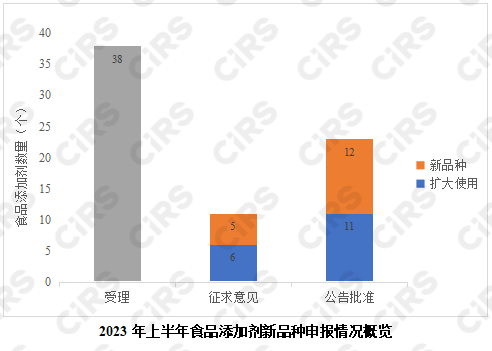 2023年上半年,卫健委共受理食品添加剂新品种申报38种,暂不能区分新品种和扩大使用。国家食品安全风险评估中心发布3次共11种食品添加剂新品种(含扩大使用范围)的公开征求意见。卫健委共批准食品添加剂新品种(含扩大使用范围)23种。