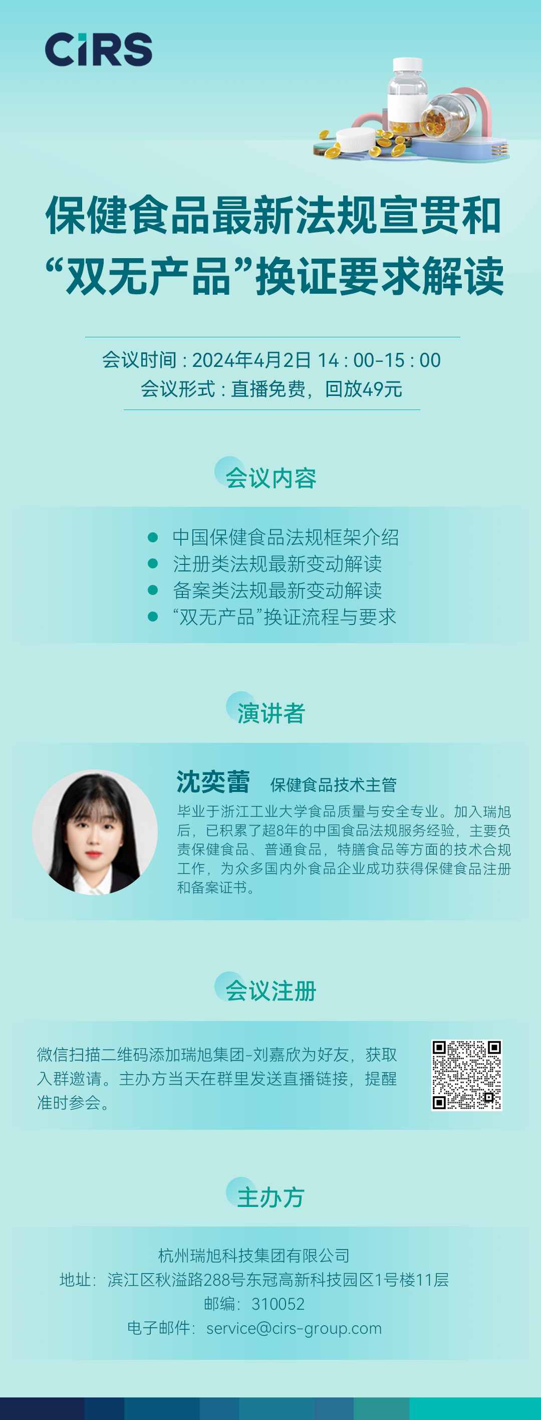 本次研讨会,瑞旭集团将对保健食品最新法规变动进行宣贯解读,并对“双无产品“的换证流程和要求等进行介绍,旨在帮助企业更好地了解保健食品法规监管要求,助力企业在五年过渡期内顺利完成“双无产品“换证工作。