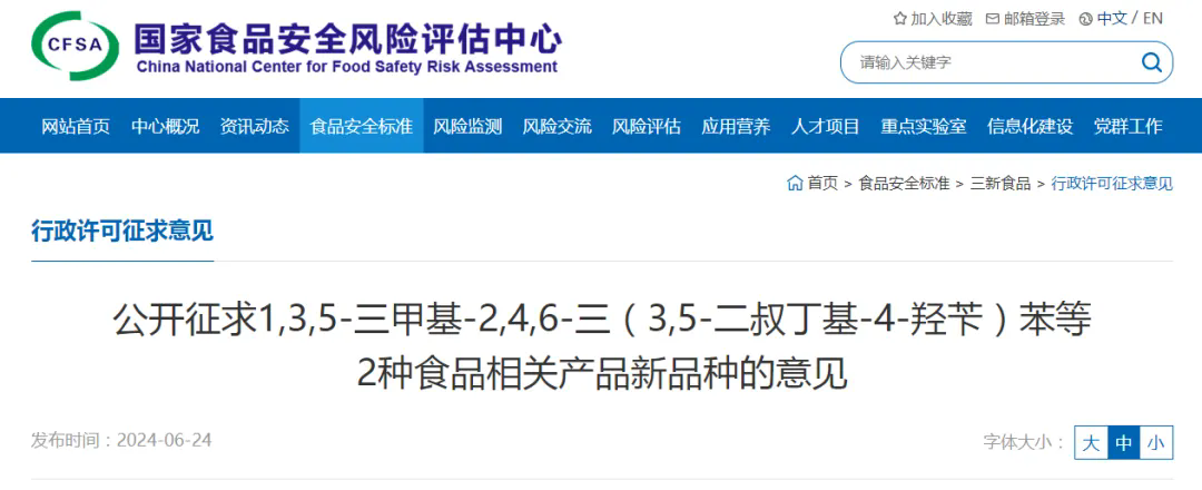 2024年6月24日,国家食品安全风险评估中心就食品接触材料及制品用添加剂扩大使用范围1,3,5-三甲基-2,4,6-三(3,5-二叔丁基-4-羟苄)苯、食品接触材料及制品用树脂新品种聚-3-羟基丁酸-3-羟基己酸酯公开征求意见。征求意见截止日期:2024年7月19日。
