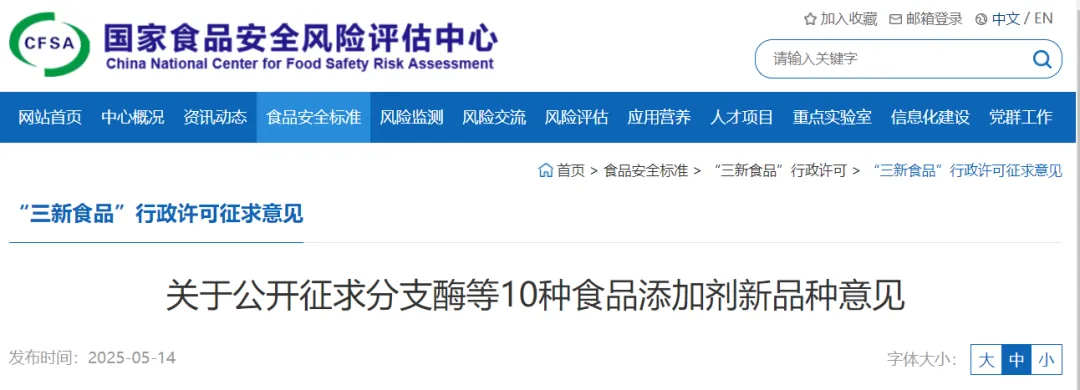 2025年5月14日,国家食品安全风险评估中心就食品添加剂新品种分支酶、食品营养强化剂新品种3-岩藻糖基乳糖、爱德万甜等5种扩大使用范围的食品添加剂、甜菊糖苷(酶转化法)等3种增补质量规格要求的食品添加剂公开征求意见。