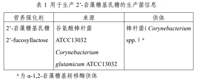 3-岩藻糖基乳糖的使用量、使用范围及质量规格要求按照国家食品安全风险评估中心《关于公开征求氨肽酶等 8 种食品添加剂新品种意见》中食品营养强化剂 3-岩藻糖基乳糖的征求意见稿内容执行(附录 C 用于生产 3-岩藻糖基乳糖的生产菌信息除外),该营养强化剂新品种的生产菌信息见下表。