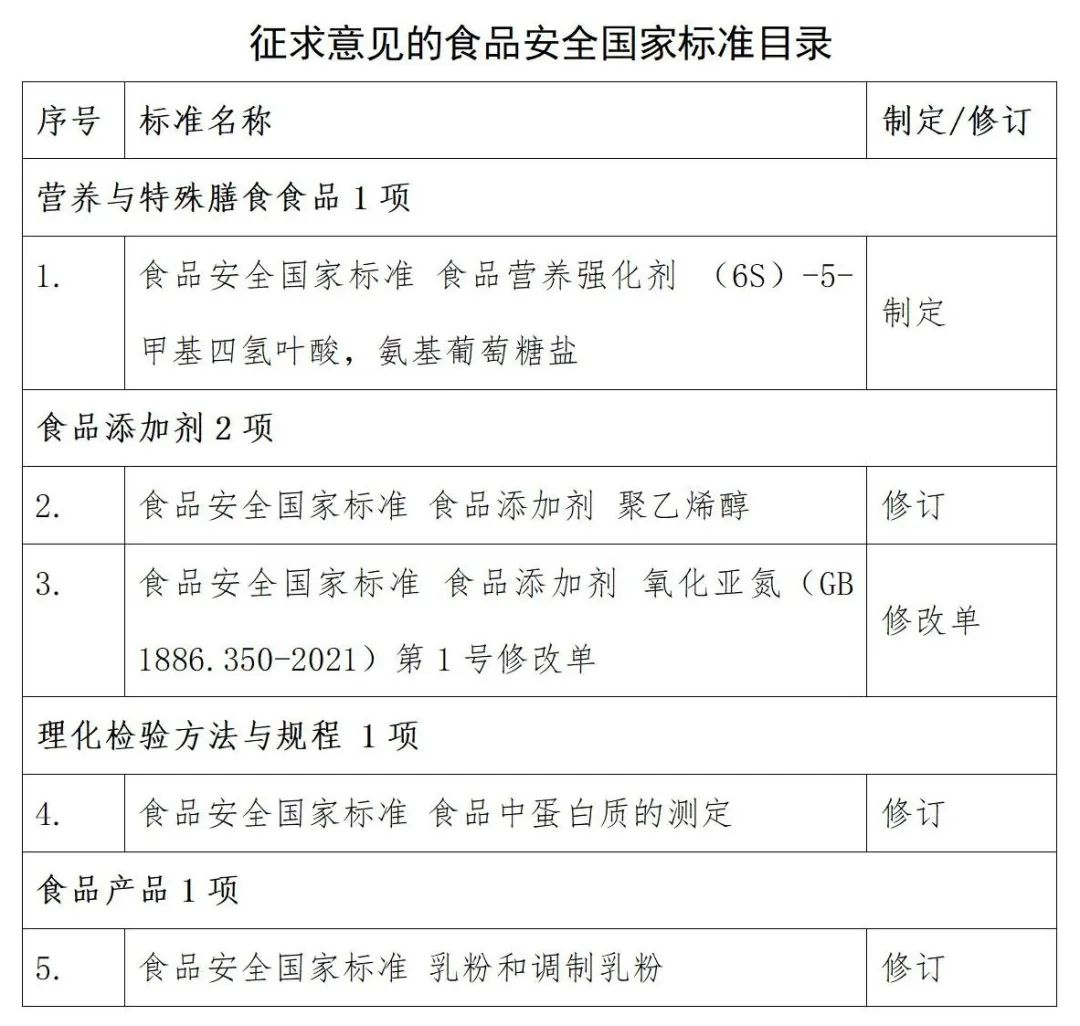根据《食品安全法》及其实施条例规定,我委组织起草了《食品安全国家标准食品营养强化剂(6S)-5-甲基四氢叶酸,氨基葡萄糖盐》等5项食品安全国家标准和修改单(征求意见稿),现向社会公开征求意见。请于2023年6月30日前登录食品安全国家标准管理信息系统,在线提交反馈意见。