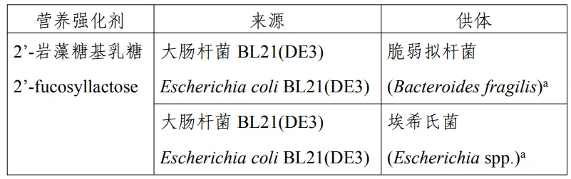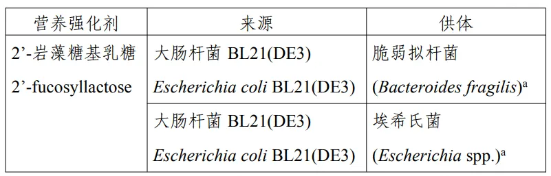 2’-岩藻糖基乳糖的用量、 使用范围及质量规格要求按照国家卫生健康委员会 2023 年第 8 号公告执行(附录 C 用于生产 2’-岩藻糖基乳糖的生产菌信息除外) , 该营养强化剂新品种的生产菌信息见下表。