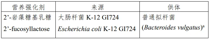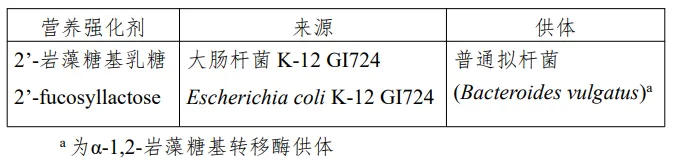 2’-岩藻糖基乳糖的用量、 使用范围及质量规格要求按照国家卫生健康委员会 2023 年第 8 号公告执行(附录 C 用于生产 2’-岩藻糖基乳糖的生产菌信息除外) , 该营养强化剂新品种的生产菌信息见下表。