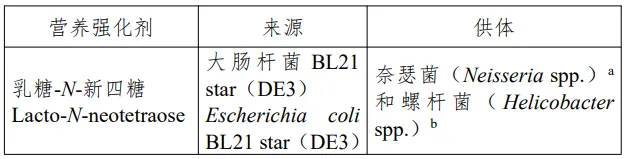 乳糖-N-新四糖的使用范围、使用量及质量规格要求按照国家卫生健康委员会 2023 年第8 号公告执行(附录C用于生产乳糖-N-新四糖的生产菌信息除外),该营养强化剂新品种的生产菌信息见下表。
