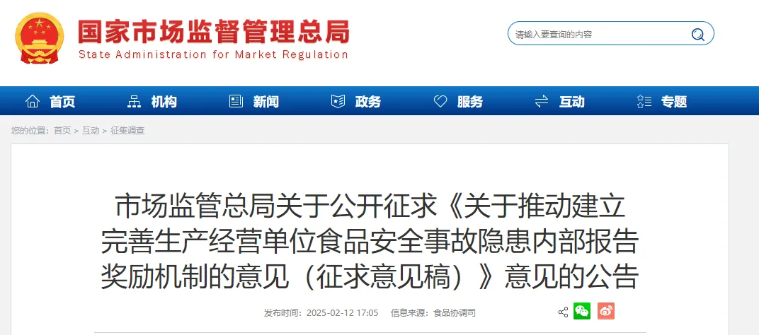 为深入落实“预防为主、风险管理、全程控制、社会共治”的食品安全工作原则,推动生产经营单位负责人与从业人员同向发力,切实保障食品安全,有效防范遏制食品安全事故发生,市场监管总局组织起草了《关于推动建立完善生产经营单位食品安全事故隐患内部报告奖励机制的意见(征求意见稿)》,现向社会公开征求意见,意见反馈截止日期为2025年3月13日。公众可以通过以下途径和方式提出意见: