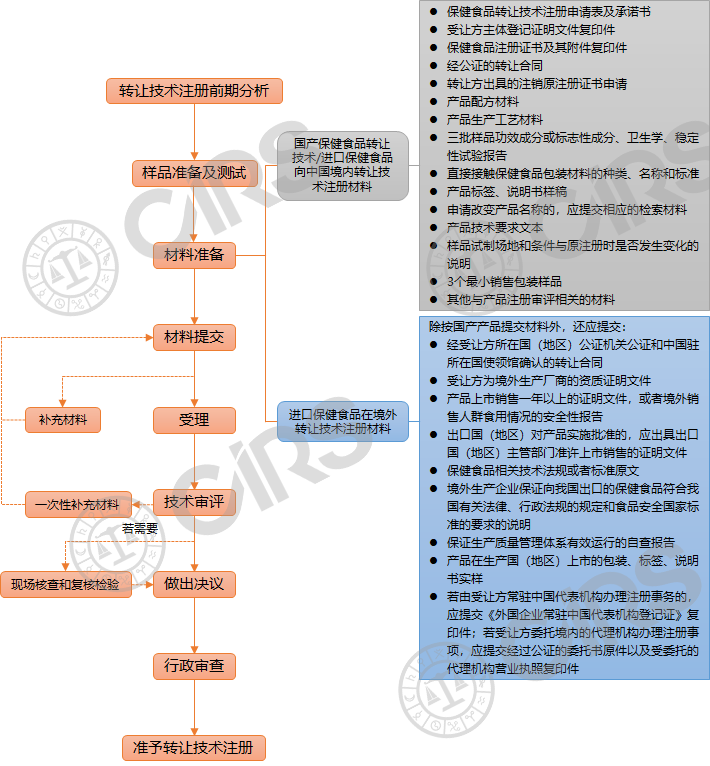 新修订的食品安全法明确规定对保健食品实行严格监督管理。为规范统一保健食品管理工作,国家市场监督管理总局(原国家食品药品监督管理总局)颁布了《保健食品注册与备案管理办法》、《保健食品注册申请服务指南》和《保健食品注册审评审批工作细则》等法律法规,明确了保健食品转让技术注册的申请材料及要求。