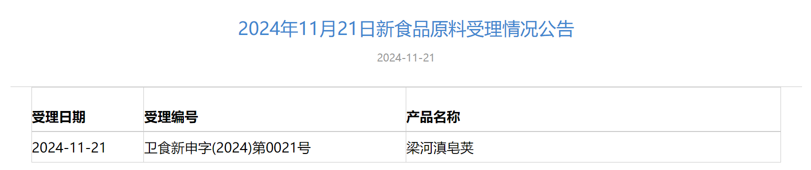 2025年01月07日,国家卫健委终止审查了一个新食品原料:梁河滇皂荚,将梁河滇皂荚(卫食新申字(2024)第0021号)认定为地方特色食品,将按照地方特色食品进行管理并允许进入市场。