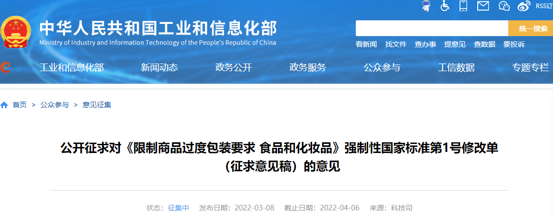 2022年3月8日,工业和信息化部科技司发布公开征求对《限制商品过度包装要求 食品和化妆品》强制性国家标准第1号修改单(征求意见稿)的意见,为进一步规范食品和化妆品包装要求,工业和信息化部组织完成了《限制商品过度包装要求 食品和化妆品》强制性国家标准第1号修改单(征求意见稿)的编制工作。为进一步听取社会各界意见,现对修改单征求意见稿及编制说明予以公示,截止日期2022年4月6日。