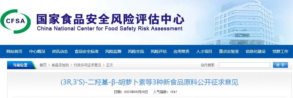 2023年8月28日,国家食品安全风险评估中心就(3R,3'S)-二羟基-β-胡萝卜素等3种新食品原料公开征求意见。征求意见截止日期:2023年9月28日,相关信息如下:
