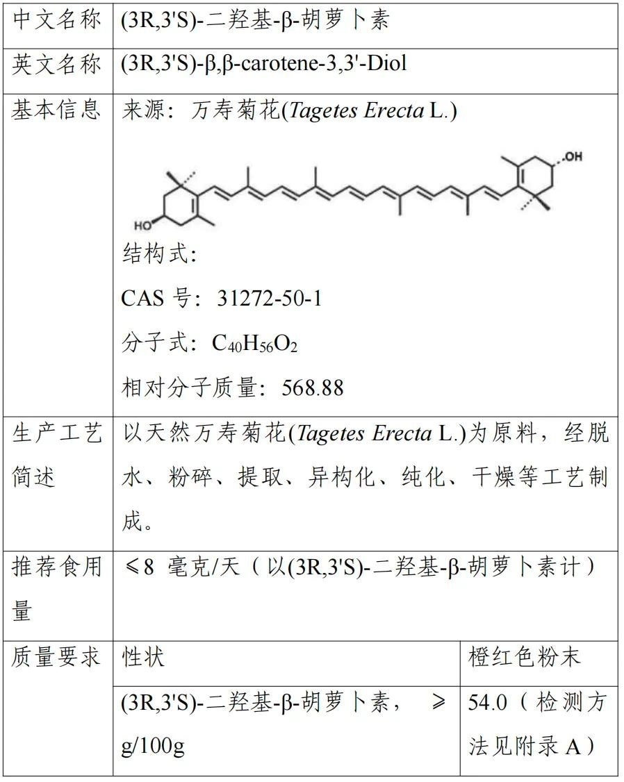 参考网站及背景资料详见: (3R,3'S)-二羟基-β-胡萝卜素等3种新食品原料公开征求意见