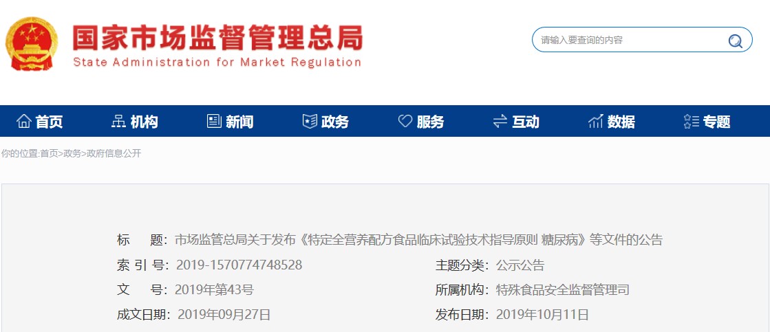 2019年10月11日,国家市场监督管理总局正式发布了《特定全营养配方食品临床试验技术指导原则 糖尿病》,《特定全营养配方食品临床试验技术指导原则 肾病》,以及《特定全营养配方食品临床试验技术指导原则 肿瘤》,并且宣布自发布之日起予以实施。由于《特殊医学用途配方食品通则》(GB 29922)的问答对此三类产品的营养素可调整范围作了规定,因此作为法规依据,可以认为其已具备生产研发以及注册工作的条件。而随着医学研究的深入以及法规体系的完善,不排除各营养素指标在后续的特定全营养产品标准中的进一步调整。例如,在GB 29922的问答中,要求肿瘤特定全营养配方食品的优质蛋白质不少于50%,而《肿瘤全营养配方食品》征求意见稿中则提到其应为全优质蛋白等。