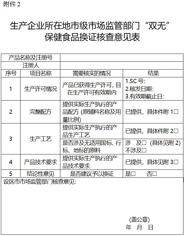 (三)设区市市场监管局出具的“双无”保健食品换证核查意见表(盖公章)详见附件2;