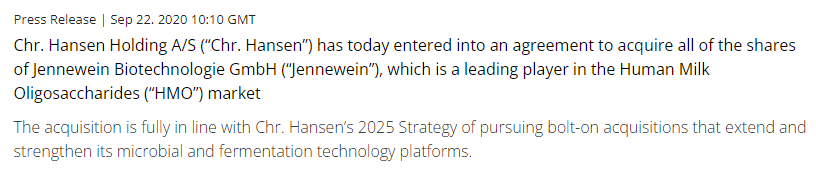 同年,科汉森(Chr. Hansen A/S)收购 Jennewein Biotechnologie GmbH,进军HMOs市场,紧密布局并顺利取得多个HMOs的欧美入市许可。