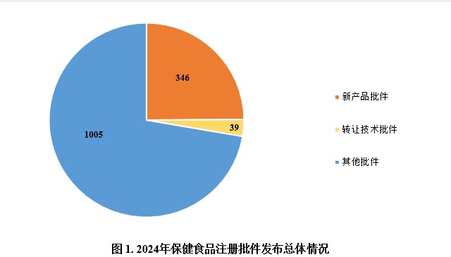 2024年发布的1390个保健食品批件中,注册号为2024年的新产品批件数量为346个,占批件总数的24.89%;转让技术的批件数量为39个,占批件总数的2.81%。此外,还包括1005个其他批件(延续注册、变更注册等)。