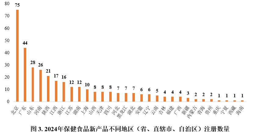 2024年注册获批的346款保健食品新产品共来自30个省份(直辖市、自治区),其中北京、广东和山东分别以75款、44款和28款的数量位列前三,占新产品总数的21.68%、12.72%和8.09%。具体省份(直辖市、自治区)及数据见下图3。