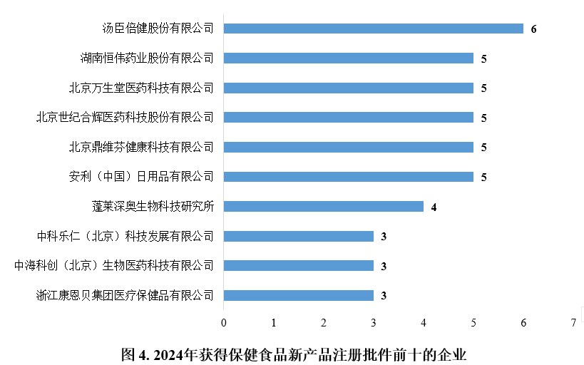 如下图4所示,汤臣倍健股份有限公司在2024年共获得6款新产品批件(具体产品信息见表1),位居第一。此外,共有5家企业获得5款新产品批件,同属第二梯队。