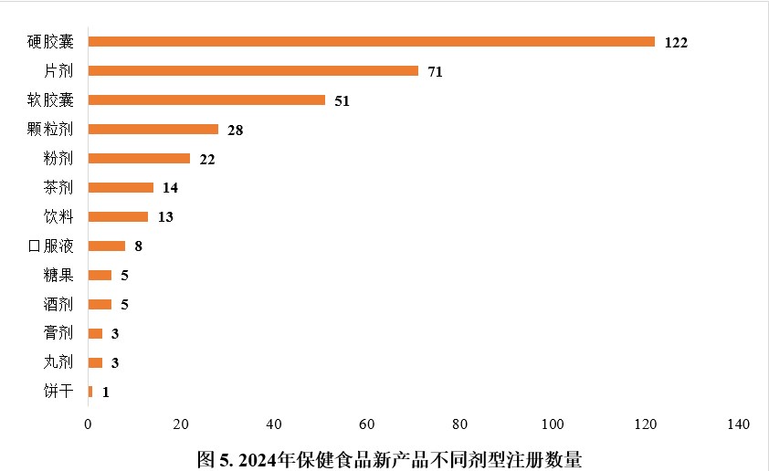 如下图5所示,2024年注册获批的保健食品新产品中,硬胶囊剂型的数量最多,共122款,占新产品总数的35.26%;其次为片剂,共71款,占新产品总数的20.52%。