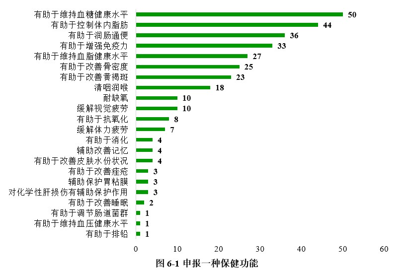 如下图6-1,2024年注册获批的新产品中,申报一种保健功能的批件共有317个,占新产品总数的91.62%。其中,保健功能为“有助于维持血糖健康水平”的产品数量最多,共50款,占单一功能新产品总量的15.77%。