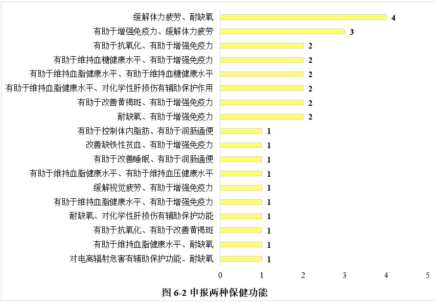 如下图6-2,2024年注册获批的新产品中,申报两种保健功能的批件共有29个,占新产品总数的8.38%。其中申报“缓解体力疲劳、耐缺氧”的产品数量最多,共4款。