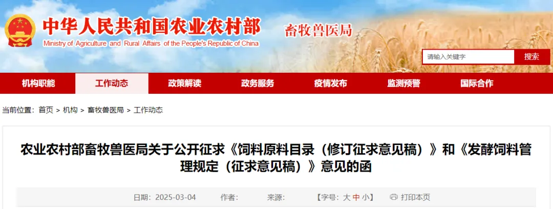 为进一步规范饲料原料使用管理,保障饲料质量安全,促进养殖业节粮降耗,农业农村部畜牧兽医局在充分调研评估的基础上,起草了《饲料原料目录(修订征求意见稿)》和《发酵饲料管理规定(征求意见稿)》,现向社会公开征求意见。请于2025年4月3日前将意见以书面或电子邮件形式反馈农业农村部畜牧兽医局饲料饲草处。