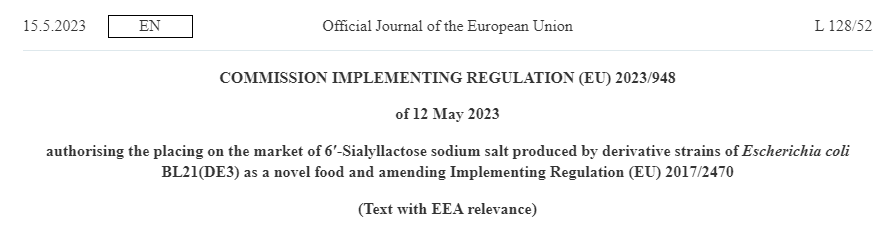 2023年5月15日,欧盟委员会发布新条例(EU) 2023/948、(EU) 2023/949,根据欧洲议会和理事会法规(EC) No 2015/2283,批准6’-唾液酸乳糖钠盐(6'-Sialyllactose sodium salt , 来源:大肠杆菌BL21 (DE3)衍生菌株)酪蛋白酸铁(Iron milk caseinate)作为新型食品投放市场。