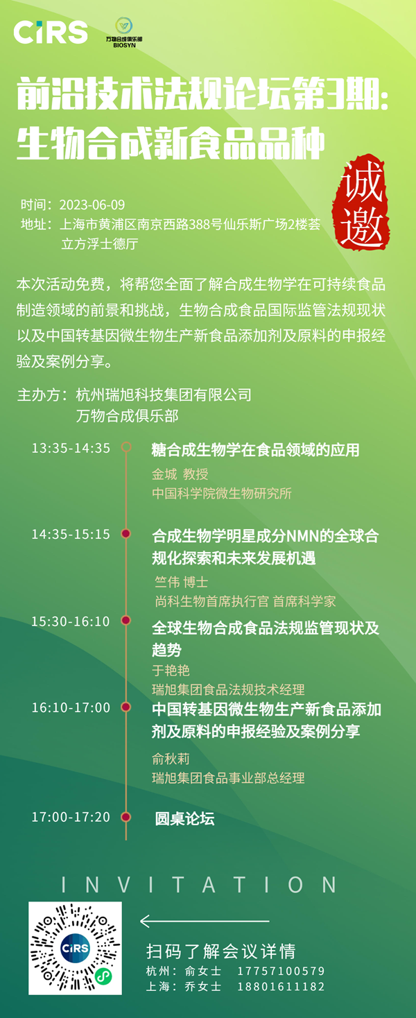 在上海举办的前沿技术法规论坛第三期:生物合成新食品品种将于6月9日下午举行,诚邀您参加。本次活动免费欢迎扫码报名参加。