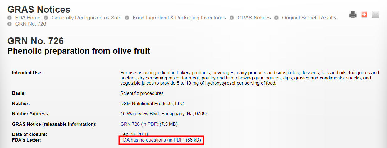 FDA GRAS (GRN No.726) | 橄榄果的酚类制剂 | 2018年2月28日 | DSM Nutritional Products, LLC. | |