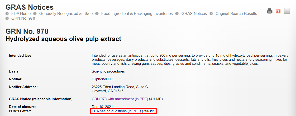 FDA GRAS (GRN No.978) | 水解橄榄浆水提物 | 2021年12月10日 | Oliphenol LLC | |