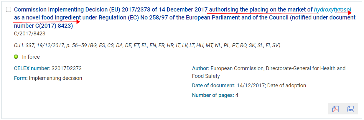 欧盟 | Novel Food | 羟基酪醇 (化学合成) | 2017年12月14日 | Seprox Biotech |