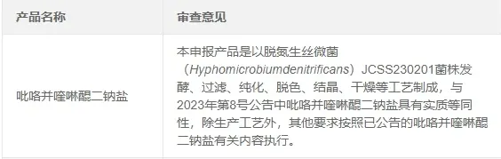 2025年1月7日国家卫生健康委员会官网更新了新食品原料终止审查目录,新增山东金城生物药业有限公司以脱氮生丝微菌(Hyphomicrobium denitrificans)JCSS230201发酵生产的吡咯并喹啉醌二钠盐(以下简称为PQQ二钠盐)。该物质审查结论为:与2023年第8号公告中吡咯并喹啉醌二钠盐具有实质等同性,除生产工艺外,其他要求按照已公告的吡咯并喹啉醌二钠盐有关内容执行。