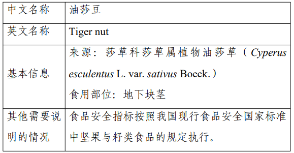 2023年10月7日,卫健委发布公告(2023年第8号),油莎豆 (Tiger nut)正式作为新食品原料获批,其食用量和使用范围未作限定。公告信息如下: