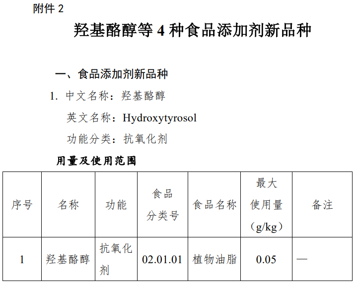 2024年8月5日,国家卫健委发布2024年第3号公告,正式批准8种“三新食品”,其中包含由瑞旭集团协助合成生物学领域客户报批的食品添加剂新品种:羟基酪醇。获批信息如下: