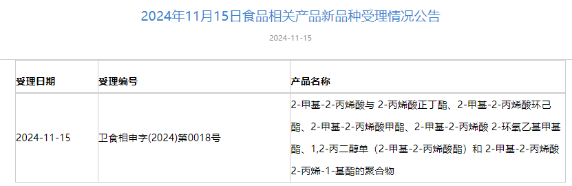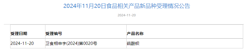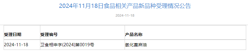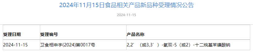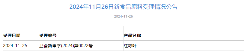 2024年11月1日-2024年11月29日,国家卫生健康委员会政务服务平台发布三新食品受理情况,新增3款新食品原料受理,新增4款食品相关产品新品种受理,新增5款食品添加剂新品种受理。