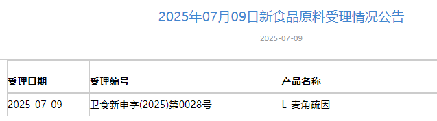1 | 2025-07-09 | 卫食新申字(2025)第0028号 | L-麦角硫因 |