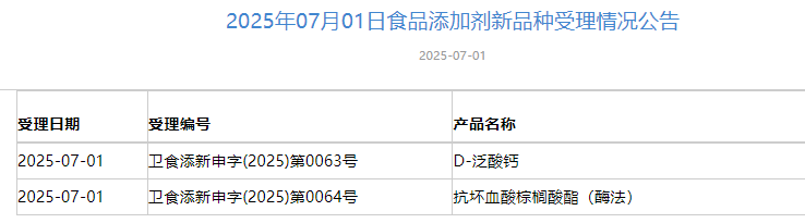 1 | 2025-07-01 | 卫食添新申字(2025)第0063号 | D-泛酸钙 |