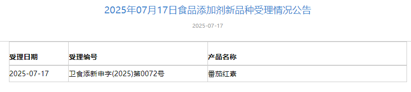 10 | 2025-07-17 | 卫食添新申字(2025)第0072号 | 番茄红素 |