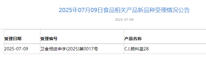 1 | 2025-07-09 | 卫食相进申字(2025)第00017号 | C.I.颜料蓝28 |