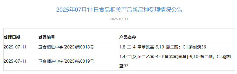 2 | 2025-07-11 | 卫食相进申字(2025)第00018号 | 1,8-二-4-甲苯氨基-9,10-蒽二酮;C.I.溶剂紫36 |