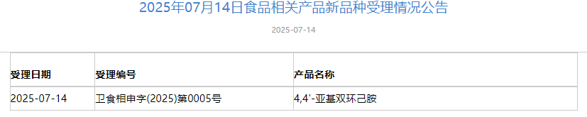 4 | 2025-07-14 | 卫食相申字(2025)第0005号 | 4,4'-亚基双环己胺 |