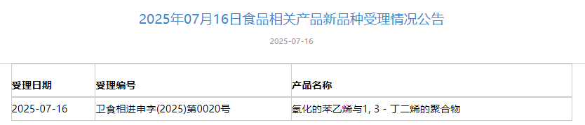 5 | 2025-07-16 | 卫食相进申字(2025)第0020号 | 氢化的苯乙烯与1, 3-丁二烯的聚合物 |