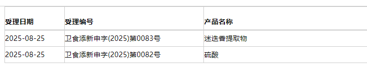1 | 2025-08-25 | 卫食添新申字(2025)第0082号 | 硫酸 |
