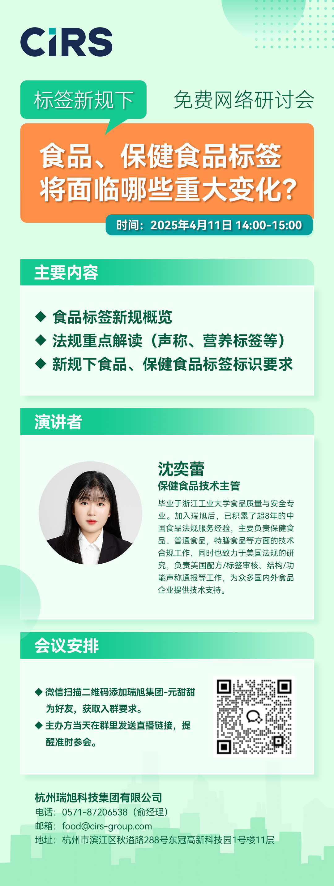 2025年3月26-27日,《食品标识监督管理办法》、《预包装食品标签通则》(GB 7718-2025)、《预包装食品营养标签通则》(GB 28050-2025)接连发布,将于2027年3月16日实施,设置2年过渡期。根据新规,很多食品、保健食品将面临标签的改版。本次网络研讨会旨在帮助食品从业者深入了解新版食品标签法规的具体内容,助力企业有效应对新规挑战,顺利过渡。