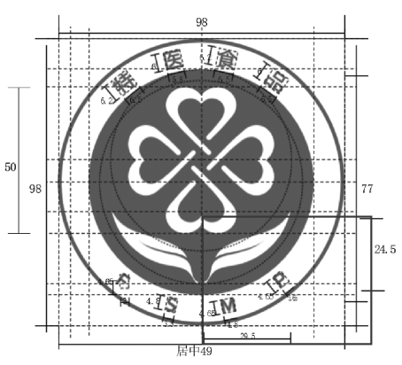 特医食品标志整体比例:98:98(高:宽),基本图案部分:77:77(高:宽)。花型图案比例:50:50(高:宽),中心位置于标识左右居中直径为62正圆中心处。叶子图案比例:24.5:61(高:宽),两叶片间距离2,叶片位置于基本图案的同心圆直径为69.5底齐,弧度基本保持一致,高度在基本图案黄金比例以下。单字比例:“特”高6.2,宽 6.5;“医”高 6,宽 5.8;“食”高 6.2,宽 6.5;“品”高 6,宽 6.5;“F”高4.65,宽3;“S”高4.8,宽3.5;“M”高4.65,宽4.5;“P”高4.65,宽3.65。