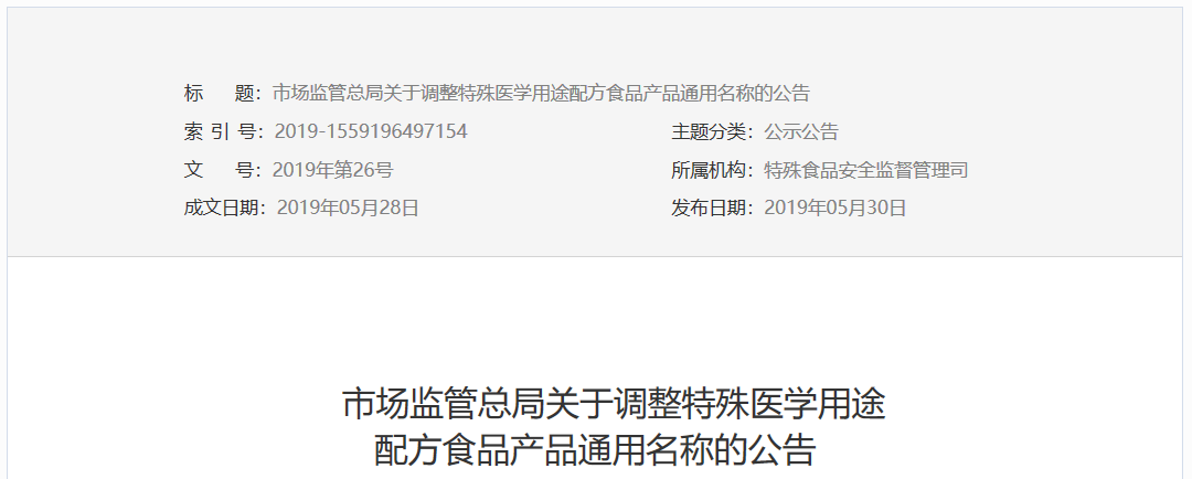 为进一步规范特殊医学用途配方食品的产品通用名称,便于消费者识记,避免产生误导,国家市场监督管理总局对其进行了适当调整,并就有关事项公告如下: