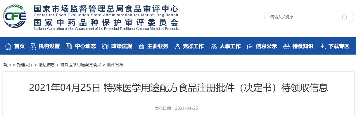 4月25日,国家市场监督管理总局食品审评中心发布特殊医学用途配方食品批件(决定书)待领取信息,涉及16款特医食品。名单如下: