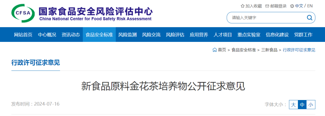 2024年7月16日,国家食品安全风险评估中心就新食品原料金花茶培养物公开征求意见。