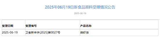 | 1 | 2025-06-19 | 卫食新申字(2025)第0027号 | 磷虾油 |